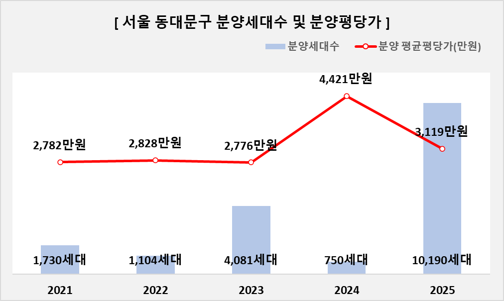 | ㅁ 서울 동대문구 21년~25년 아파트 분양건수 29건, 분양세대수 17,855세대, 분양 평균평당가(만원) 3,185만원 입니다. 세부 연도별로는 - 21년 아파트 분양건수 9건, 분양세대수 1,730세대, 분양 평균평당가(만원) 2,782만원 - 22년 아파트 분양건수 2건, 분양세대수 1,104세대, 분양 평균평당가(만원) 2,828만원 - 23년 아파트 분양건수 7건, 분양세대수 4,081세대, 분양 평균평당가(만원) 2,776만원 - 24년 아파트 분양건수 5건, 분양세대수 750세대, 분양 평균평당가(만원) 4,421만원 - 25년 아파트 분양건수 6건, 분양세대수 10,190세대, 분양 평균평당가(만원) 3,119만원 |