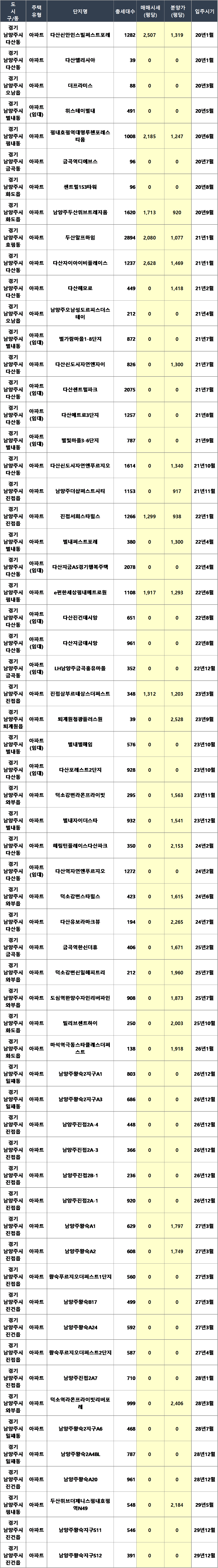 | ㅁ 경기 남양주시 21년~25년 아파트 분양건수 32건, 분양세대수 27,305세대, 분양 평균평당가(만원) 1,605만원 입니다. 세부 연도별로는 - 21년 아파트 분양건수 11건, 분양세대수 13,376세대, 분양 평균평당가(만원) 1,254만원 - 22년 아파트 분양건수 7건, 분양세대수 6,796세대, 분양 평균평당가(만원) 1,177만원 - 23년 아파트 분양건수 6건, 분양세대수 3,118세대, 분양 평균평당가(만원) 1,709만원 - 24년 아파트 분양건수 4건, 분양세대수 2,239세대, 분양 평균평당가(만원) 2,011만원 - 25년 아파트 분양건수 4건, 분양세대수 1,776세대, 분양 평균평당가(만원) 1,877만원 |