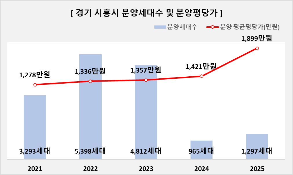 | ㅁ 경기 시흥시 21년~25년 아파트 분양건수 25건, 분양세대수 15,765세대, 분양 평균평당가(만원) 1,458만원 입니다. 세부 연도별로는 - 21년 아파트 분양건수 7건, 분양세대수 3,293세대, 분양 평균평당가(만원) 1,278만원 - 22년 아파트 분양건수 8건, 분양세대수 5,398세대, 분양 평균평당가(만원) 1,336만원 - 23년 아파트 분양건수 7건, 분양세대수 4,812세대, 분양 평균평당가(만원) 1,357만원 - 24년 아파트 분양건수 2건, 분양세대수 965세대, 분양 평균평당가(만원) 1,421만원 - 25년 아파트 분양건수 1건, 분양세대수 1,297세대, 분양 평균평당가(만원) 1,899만원 |