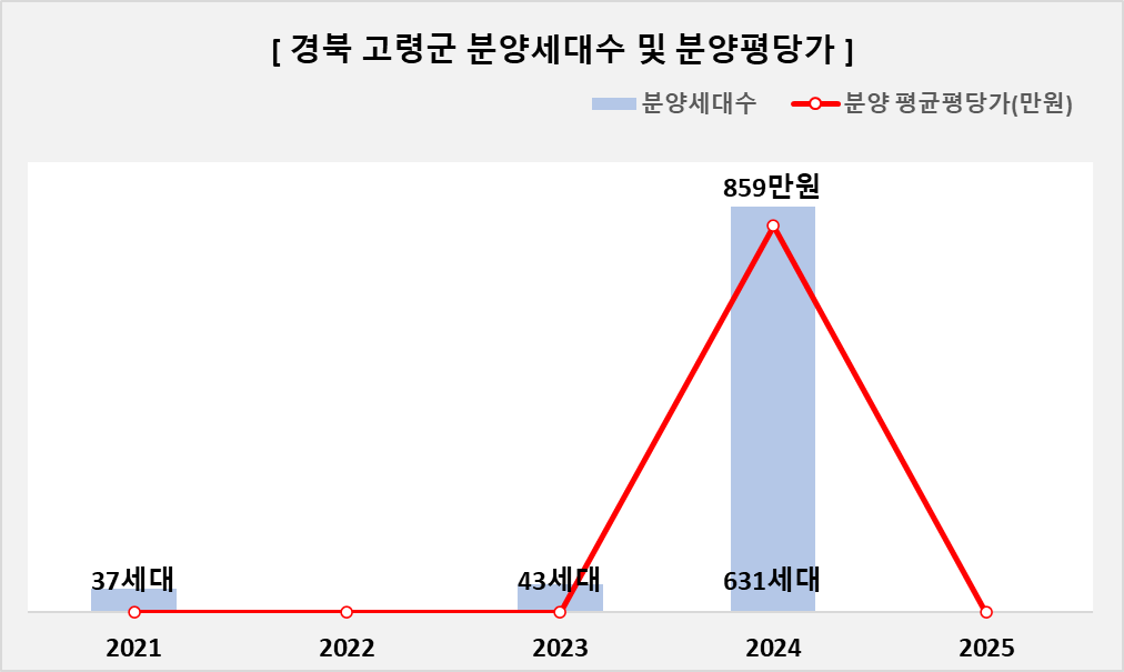 | ㅁ 경북 고령군 21년~25년 아파트 분양건수 3건, 분양세대수 711세대, 분양 평균평당가(만원) 859만원 입니다. 세부 연도별로는 - 21년 아파트 분양건수 1건, 분양세대수 37세대(임대) - 22년 없음 - 23년 아파트 분양건수 1건, 분양세대수 43세대(임대) - 24년 아파트 분양건수 1건, 분양세대수 631세대, 분양 평균평당가(만원) 859만원 - 25년 없음 |