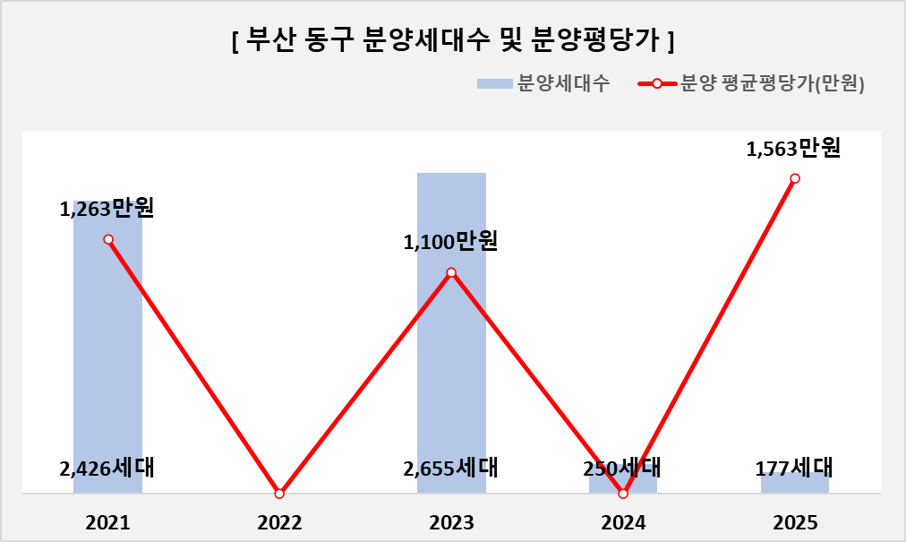 | ㅁ 부산 동구 21년~25년 아파트 분양건수 11건, 분양세대수 5,508세대, 분양 평균평당가(만원) 1,309만원 입니다. 세부 연도별로는 - 21년 아파트 분양건수 6건, 분양세대수 2,426세대, 분양 평균평당가(만원) 1,263만원 - 22년 없음 - 23년 아파트 분양건수 3건, 분양세대수 2,655세대, 분양 평균평당가(만원) 1,100만원 - 24년 아파트 분양건수 1건, 분양세대수 250세대(임대) - 25년 아파트 분양건수 1건, 분양세대수 177세대, 분양 평균평당가(만원) 1,563만원 |