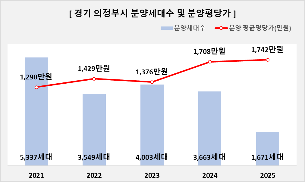 | ㅁ 경기 의정부시 21년~25년 아파트 분양건수 32건, 분양세대수 18,223세대, 분양 평균평당가(만원) 1,509만원 입니다. 세부 연도별로는 - 21년 아파트 분양건수 8건, 분양세대수 5,337세대, 분양 평균평당가(만원) 1,290만원 - 22년 아파트 분양건수 4건, 분양세대수 3,549세대, 분양 평균평당가(만원) 1,429만원 - 23년 아파트 분양건수 7건, 분양세대수 4,003세대, 분양 평균평당가(만원) 1,376만원 - 24년 아파트 분양건수 9건, 분양세대수 3,663세대, 분양 평균평당가(만원) 1,708만원 - 25년 아파트 분양건수 4건, 분양세대수 1,671세대, 분양 평균평당가(만원) 1,742만원 |