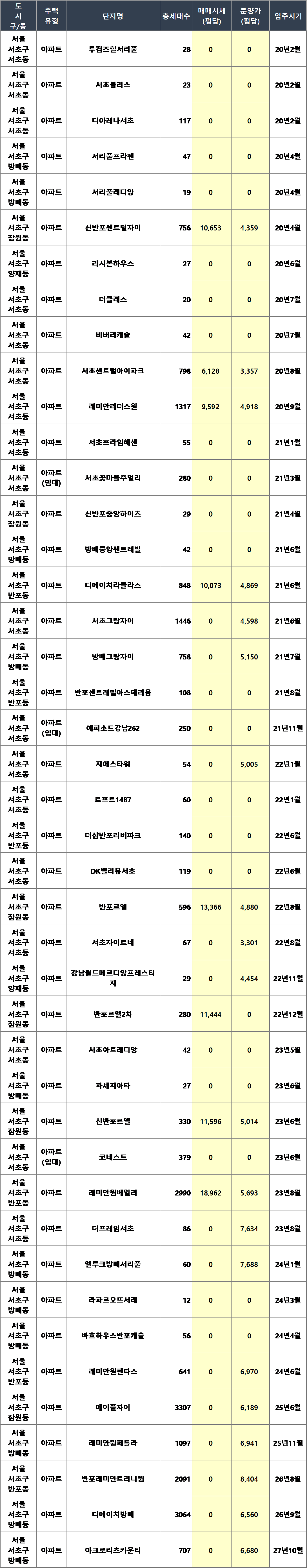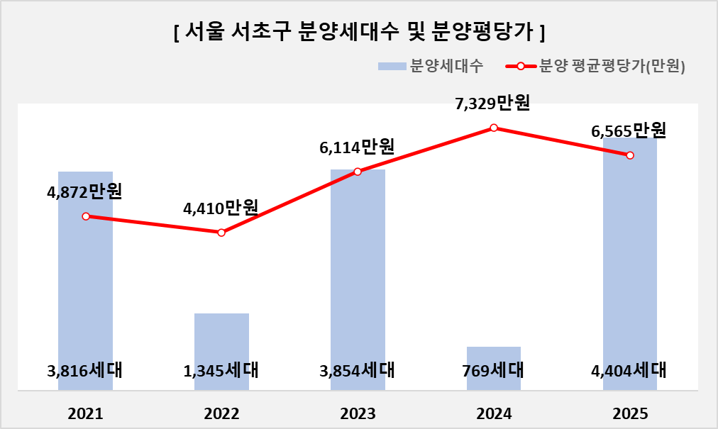 | ㅁ 서울 서초구 21년~25년 아파트 분양건수 29건, 분양세대수 14,188세대, 분양 평균평당가(만원) 5,858만원 입니다. 세부 연도별로는 - 21년 아파트 분양건수 9건, 분양세대수 3,816세대, 분양 평균평당가(만원) 4,872만원 - 22년 아파트 분양건수 8건, 분양세대수 1,345세대, 분양 평균평당가(만원) 4,410만원 - 23년 아파트 분양건수 6건, 분양세대수 3,854세대, 분양 평균평당가(만원) 6,114만원 - 24년 아파트 분양건수 4건, 분양세대수 769세대, 분양 평균평당가(만원) 7,329만원 - 25년 아파트 분양건수 2건, 분양세대수 4,404세대, 분양 평균평당가(만원) 6,565만원 |