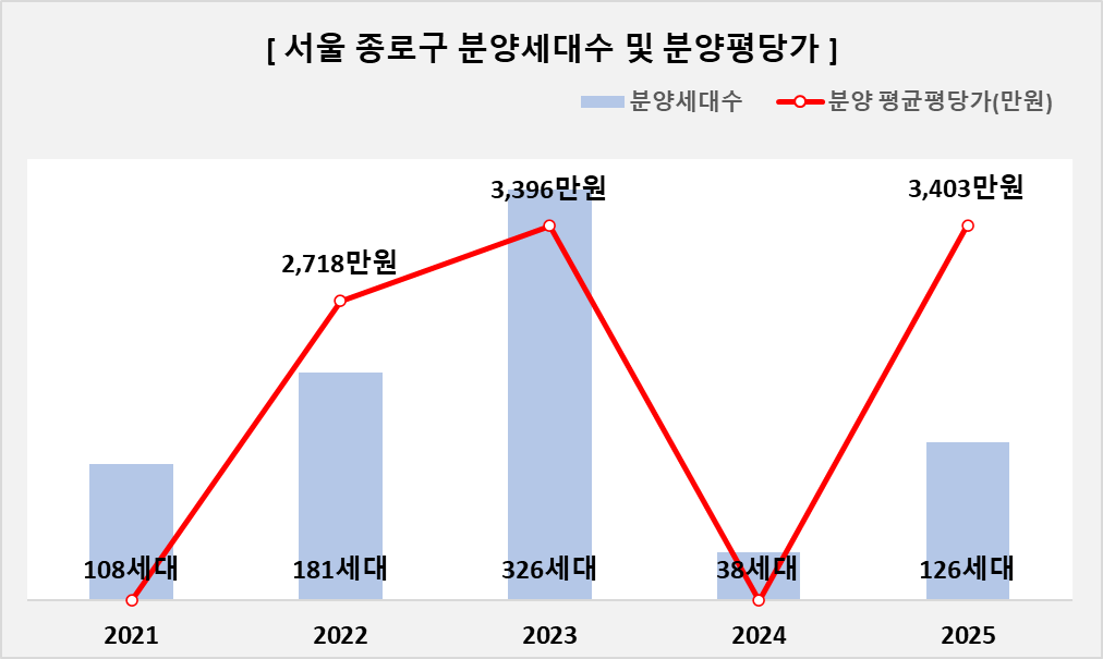 | ㅁ 서울 종로구 21년~25년 아파트 분양건수 7건, 분양세대수 779세대, 분양 평균평당가(만원) 3,172만원 입니다. 세부 연도별로는 - 21년 아파트 분양건수 1건, 분양세대수 108세대(임대) - 22년 아파트 분양건수 1건, 분양세대수 181세대, 분양 평균평당가(만원) 2,718만원 - 23년 아파트 분양건수 3건, 분양세대수 326세대, 분양 평균평당가(만원) 3,396만원 - 24년 아파트 분양건수 1건, 분양세대수 38세대(임대) - 25년 아파트 분양건수 1건, 분양세대수 126세대, 분양 평균평당가(만원) 3,403만원 |